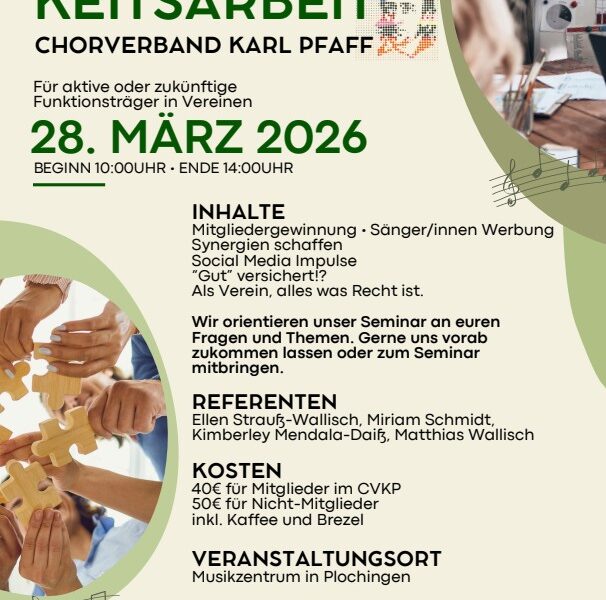 der Chorverband Karl Pfaff bietet am 28.03.2026 wieder ein Vorständeseminar an. Thema in diesem Jahr Öffentlichkeitsarbeit. Themen wie Mitgliedergewinnung, Werbung, Social Media und noch viele weitere interessante Punkte stehen auf dem Programm.